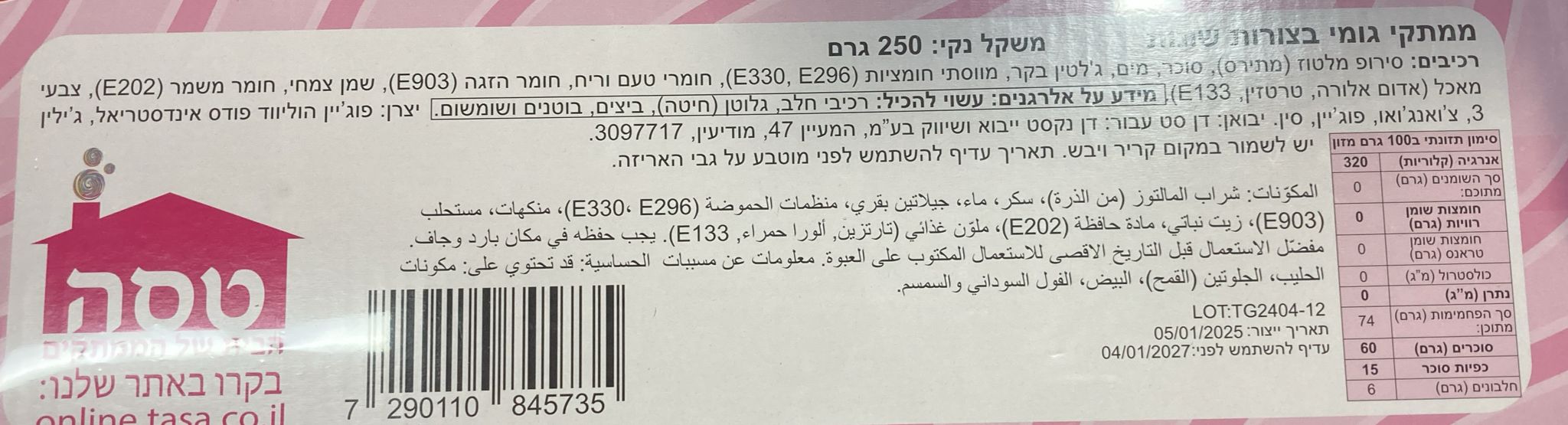 לשאלות על רכיבים ו / או אלרגיות נא לפנות לשירות לקוחות *9242